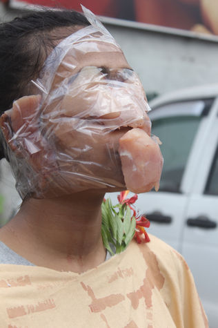 Using texts as an extension of the performance I invited my viewers to stamp ‘eyes to see’, ‘nose to smell’, ‘tongue to taste’, ‘ear to hear’ & ‘skin to touch’ with blood on my body. The action of stamping on my flesh left blood stains on my body and their hands. The action of stamping is a reminder of our indirect involvement with the contemporary political instability around us. We cannot forget the fact that we live in between the living and the dead now.